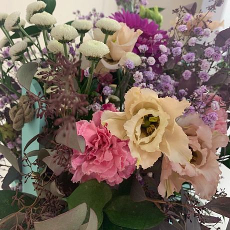 <p>На фото - Букет цветов "Частичка радости". В составе данной композиции: Ящик деревянный - 1 шт.; Эустома - 3 шт.; Эвкалипт Микс - 3 шт.; Гипсофила - 4 шт.; Гвоздика - 3 шт.; Хризантема кустовая - 4 шт.; Рускус - 7 шт..</p> <p>На сайте "Доступная доставка цветов" Вы найдете большой выбор недорогих букетов, цветочных композиций для любого повода.</p> <p>У нас можно заказать Букет цветов "Частичка радости" с доставкой по Москве.</p>