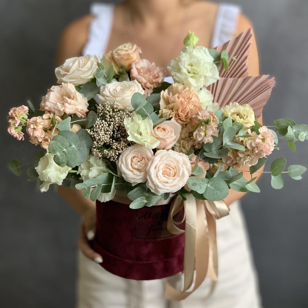 На фото - Букет цветов "Шармель". В составе данной композиции: Роза кустовая пионовидная - 4 шт.; Эустома - 6 шт.; Маттиола - 3 шт.; Озотамнус - 1 шт.; Стифа - 2 шт.; Гвоздика - 1 шт.; Эвкалипт - 4 шт.; Шляпная коробка - 1 шт.; Лента - 1 шт.; псташ - 2 шт..