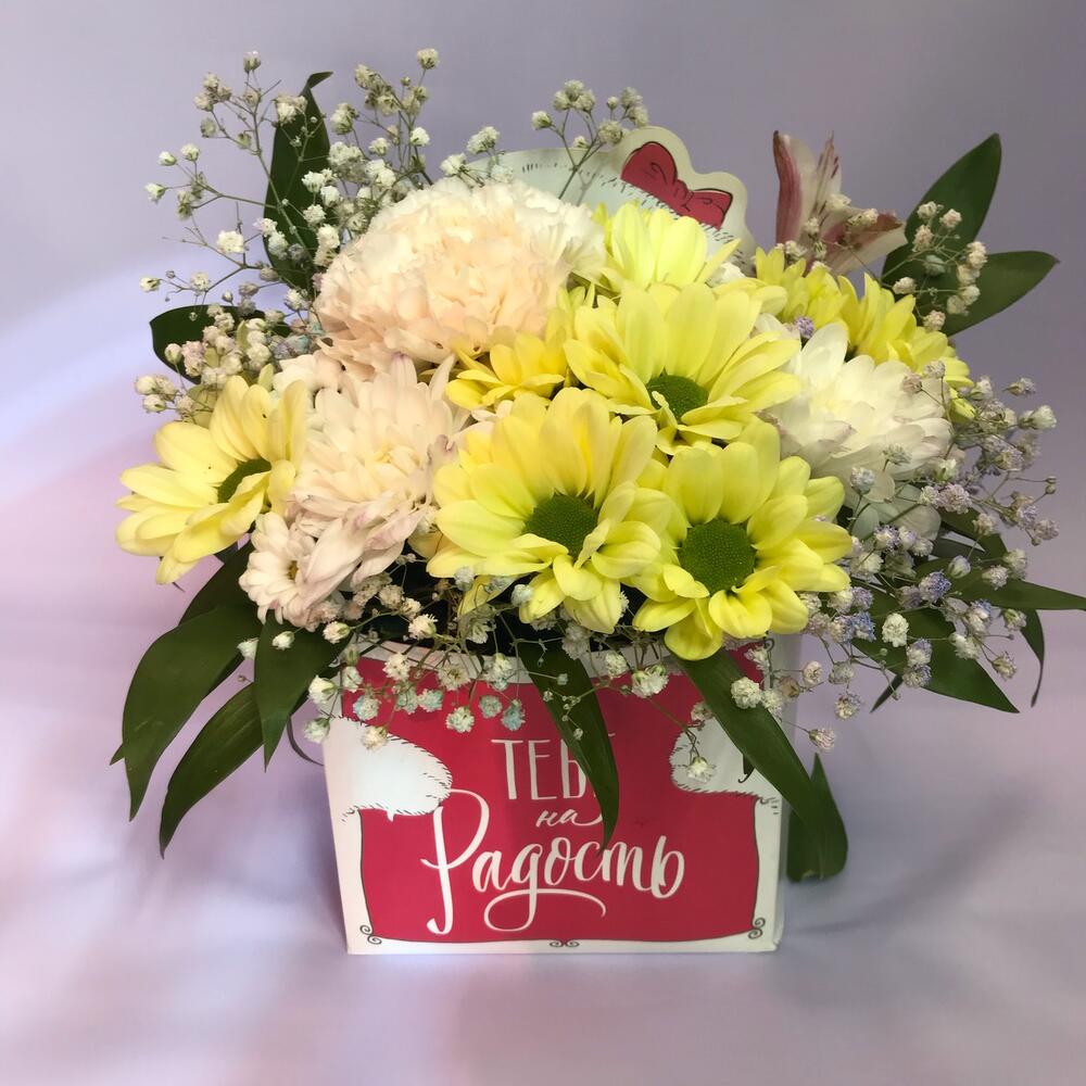 <p>На фото - Букет цветов "Тебе на радость". В составе данной композиции: Хризантема кустовая - 2 шт.; гвоздика ваниль - 1 шт.; Гипсофила - 2 шт.; Рускус - 2 шт.; Коробка - 1 шт.; Оазис флористический - 1 шт..</p> <p>На сайте "Доступная доставка цветов" Вы найдете большой выбор недорогих букетов, цветочных композиций для любого повода.</p> <p>У нас можно заказать Букет цветов "Тебе на радость" с доставкой по Москве.</p>