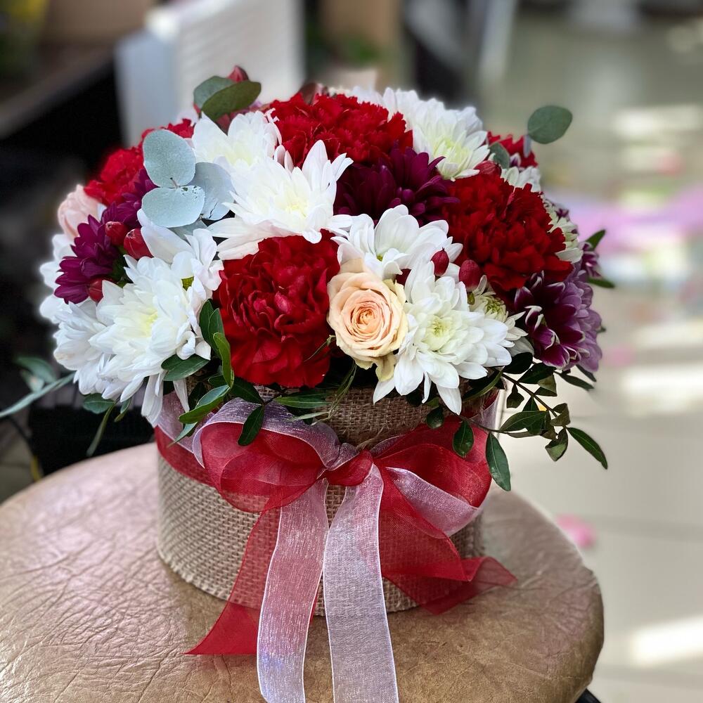 На фото - Цветы в коробке №340. В составе данной композиции: Хризантема кустовая - 7 шт.; Гвоздика - 5 шт.; Эвкалипт Baby Blue - 1 шт.; Писташ - 5 шт.; Кашпо - 1 шт..