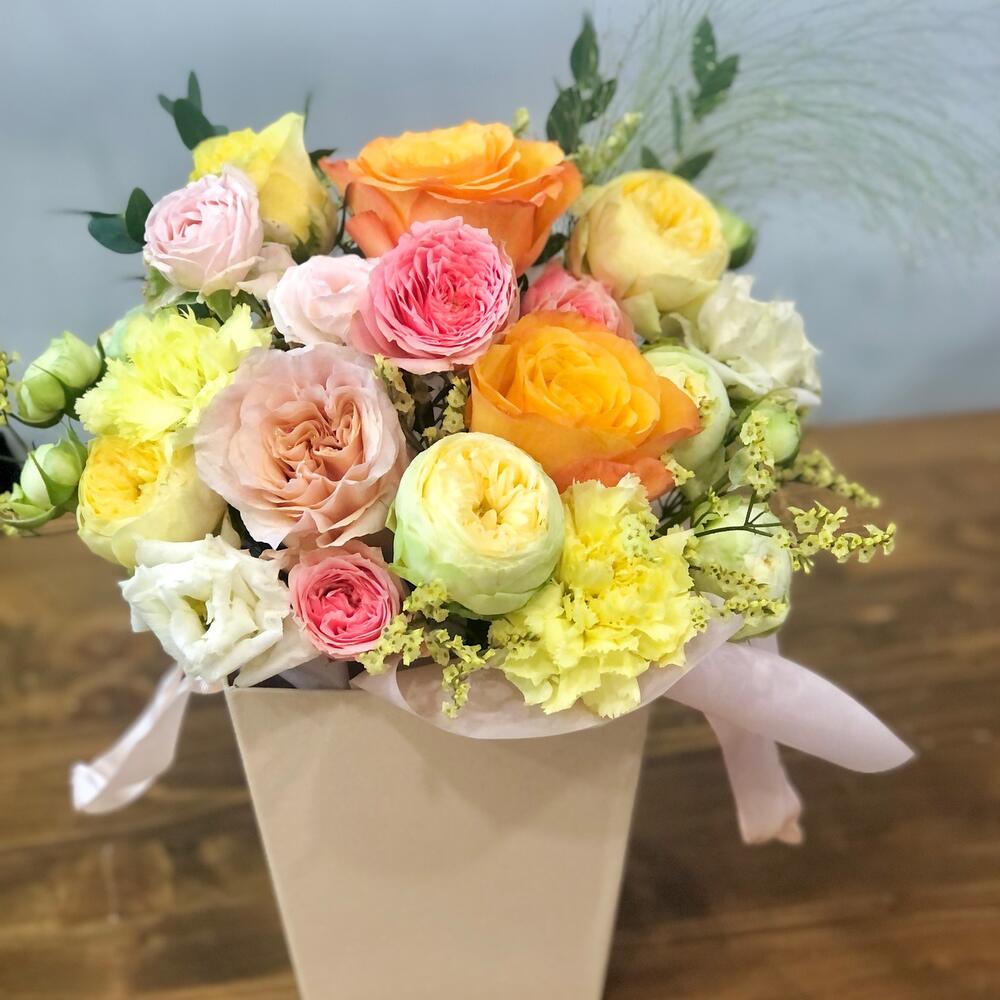 На фото - Цветы в коробке №769. В составе данной композиции: Роза кустовая пионовидная - 2 шт.; Роза кустовая - 1 шт.; Гвоздика - 2 шт.; Лимониум - 1 шт.; Эвкалипт - 1 шт.; Паникум - 1 шт.; Роза Кенийская - 4 шт.; Коробка трапеция - 1 шт..