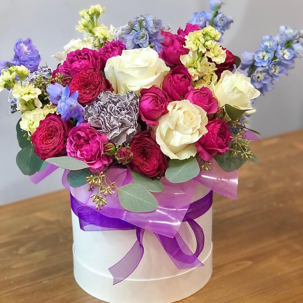 На фото - Цветы в коробке №869. В составе данной композиции: Роза пионовидная - 7 шт.; Роза кустовая пионовидная - 7 шт.; Маттиола - 3 шт.; гвоздика премиум - 3 шт.; Дельфиниум голубой - 3 шт.; Эвкалипт - 3 шт.; Роза Эквадор - 5 шт.; Коробка шляпная большая - 1 шт..
