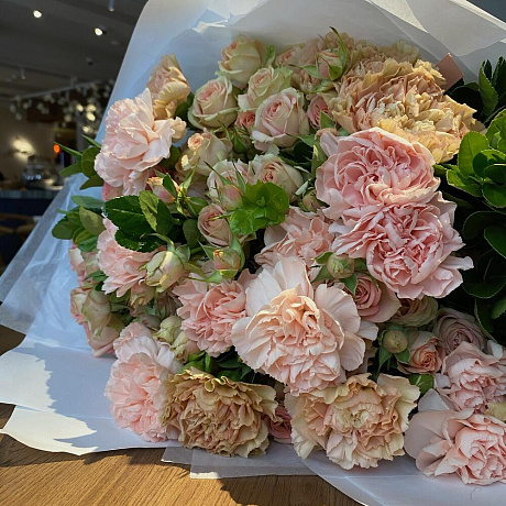 Дуэт Гвоздика и кустовая Роза — отличный выбор для подарка! На сайте вы найдете красочные фотографии, которые помогут сделать выбор. Цена букета — 5650 руб.