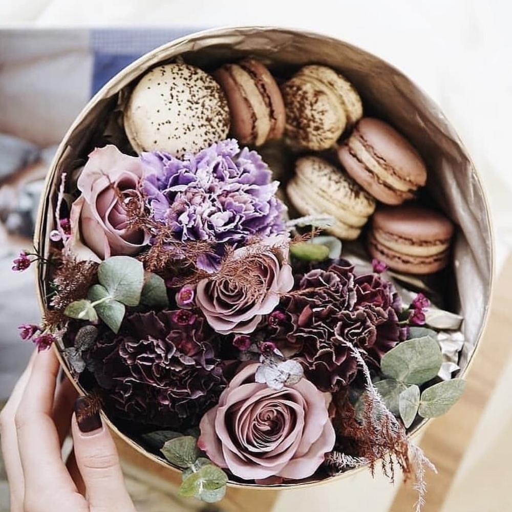 На фото - Коробка с цветами "Рапсодия". В составе данной композиции: Макарон - 6 шт.; Гвоздика сортовая - 3 шт.; Роза - 3 шт.; декоративная зелень - 3 шт.; Коробка - 1 шт..