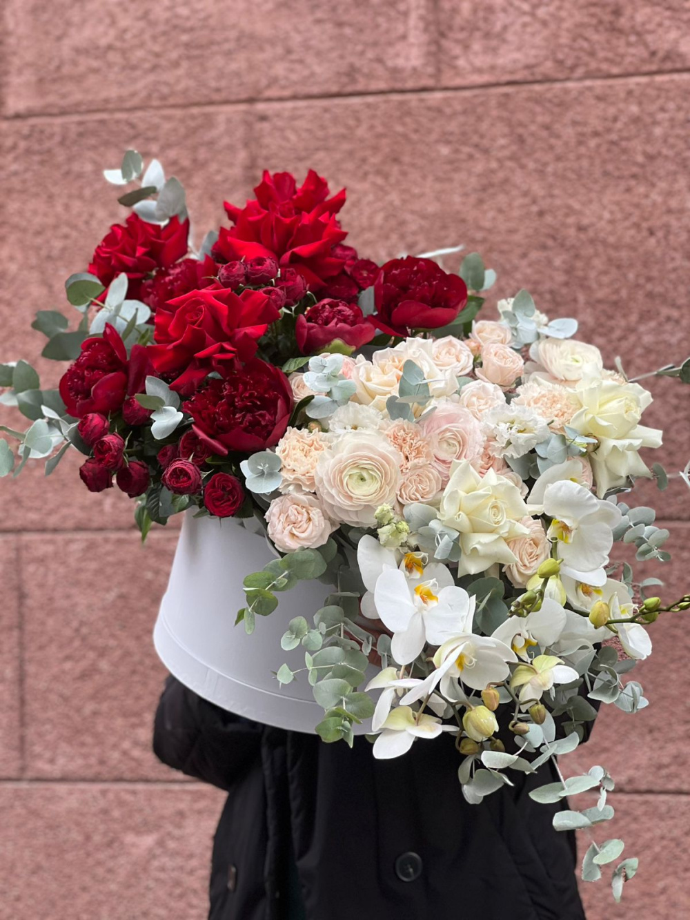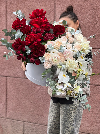 На фото - Коробка с цветами "Затерянный мир". В составе данной композиции: Ранункулюс - 3, гвоздика - 6, роза эквадор - 7, роза кустовая - 7, фаленопсис - 2, пион - 5, эвкалипт, коробка.