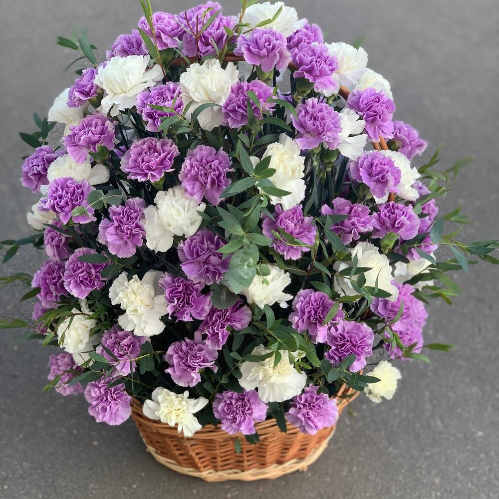 На фото - Корзина с цветами №375. В составе данной композиции: Гвоздика сортовая - 101 шт.; Эвкалипт - 15 шт.; Корзина плетеная - 1 шт.; Оазис флористический - 2 шт..