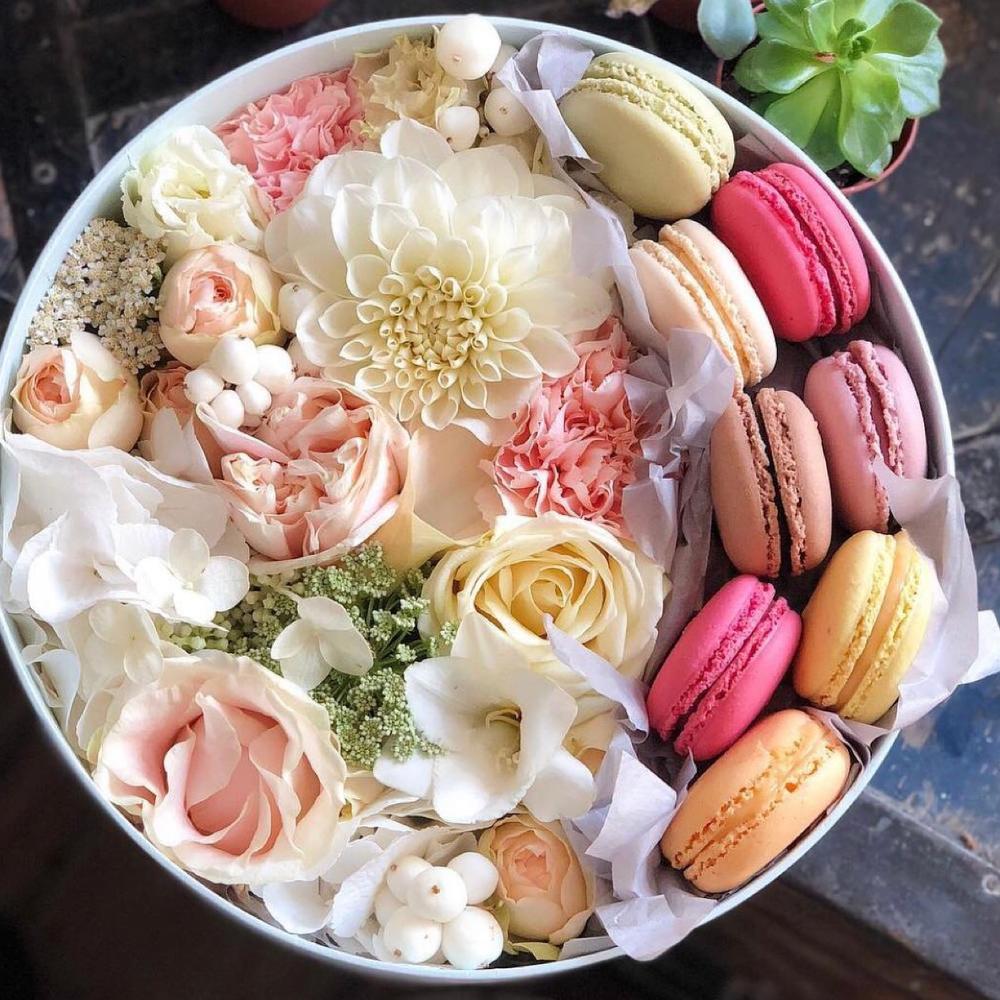 На фото - Красивая коробка цветов «Наслаждение». В составе данной композиции: Роза пионовидная - 3 шт.; Роза кустовая пионовидная - 3 шт.; Гвоздика - 3 шт.; Жасмин - 4 шт.; макарон (пирожное) - 8 шт.; Коробка - 1 шт..