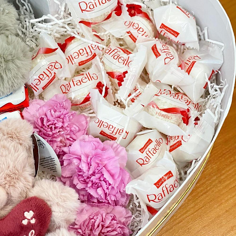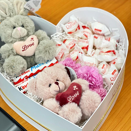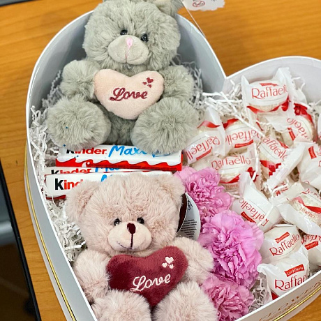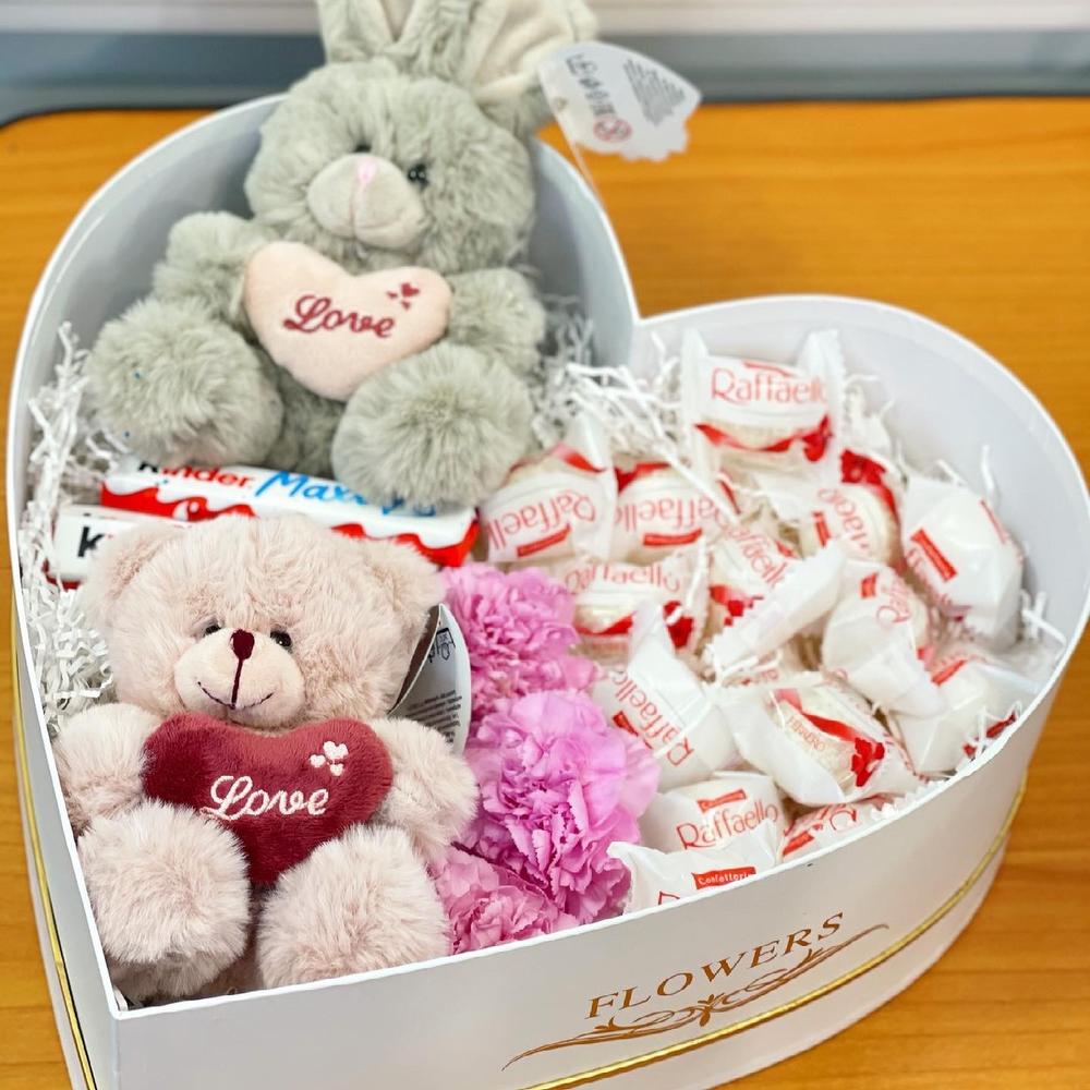 На фото - Набор подарочный. В составе данной композиции: мишка коллекционный - 1 шт.; зайка коллекционный - 1 шт.; Киндер шоколад - 3 шт.; раффаэлло 150 гр - 1 шт.; стружка наполнитель - 1 шт.; Коробка - 1 шт.; Гвоздика лунная одноголовая - 3 шт..