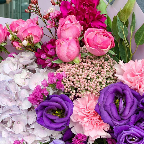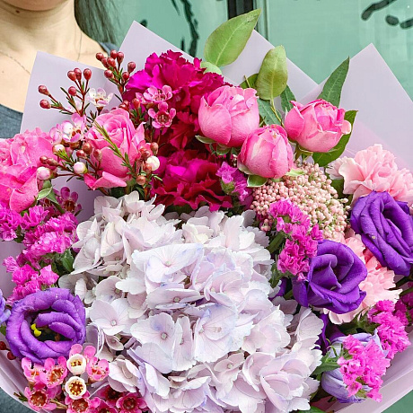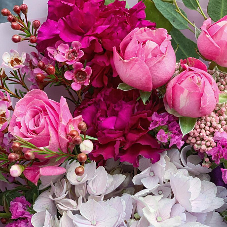 Закажите Яркий букет с воздушной гортензией, пионовидной кустовой розой и ароматным хамелациумом с доставкой в Москве и МО.