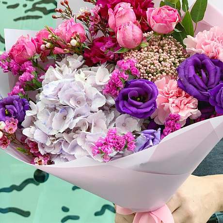Яркий букет с воздушной гортензией, пионовидной кустовой розой и ароматным хамелациумом — отличный выбор для подарка! На сайте вы найдете красочные фотографии, которые помогут сделать выбор. Цена букета — 3900 руб.