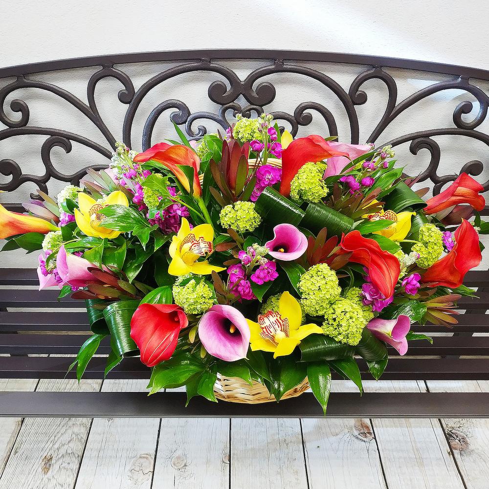 На фото - Корзина цветов "Эпика" (классика). В составе данной композиции: Калла - 20 шт.; Орхидея Цимбидиум - 7 шт.; Маттиола - 15 шт.; Калина зеленая - 7 шт.; левкадендрон - 7 шт.; Зелень - 1 шт.; Корзина - 1 шт.; Оазис - 1 шт.; Аспидистра - 10 шт.; Рускус - 10 шт..