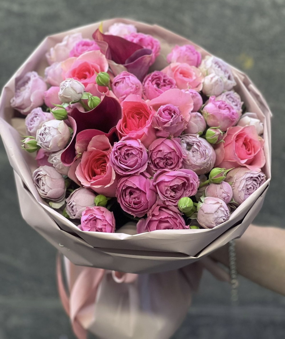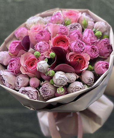 На фото - Букет цветов "Марибэль" №2. В составе данной композиции: Роза кустовая пионовидная - 9 шт.; Калла - 2 шт.; Роза пионовидная - 3 шт.; Дизайнерская упаковка.