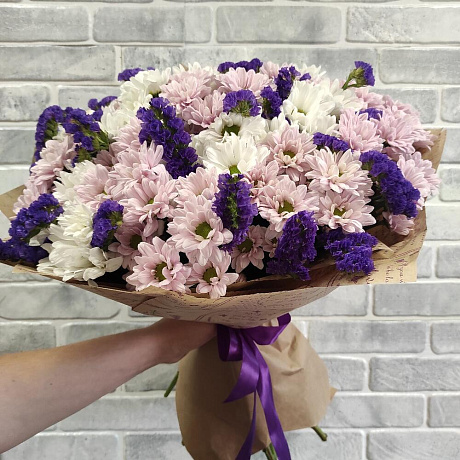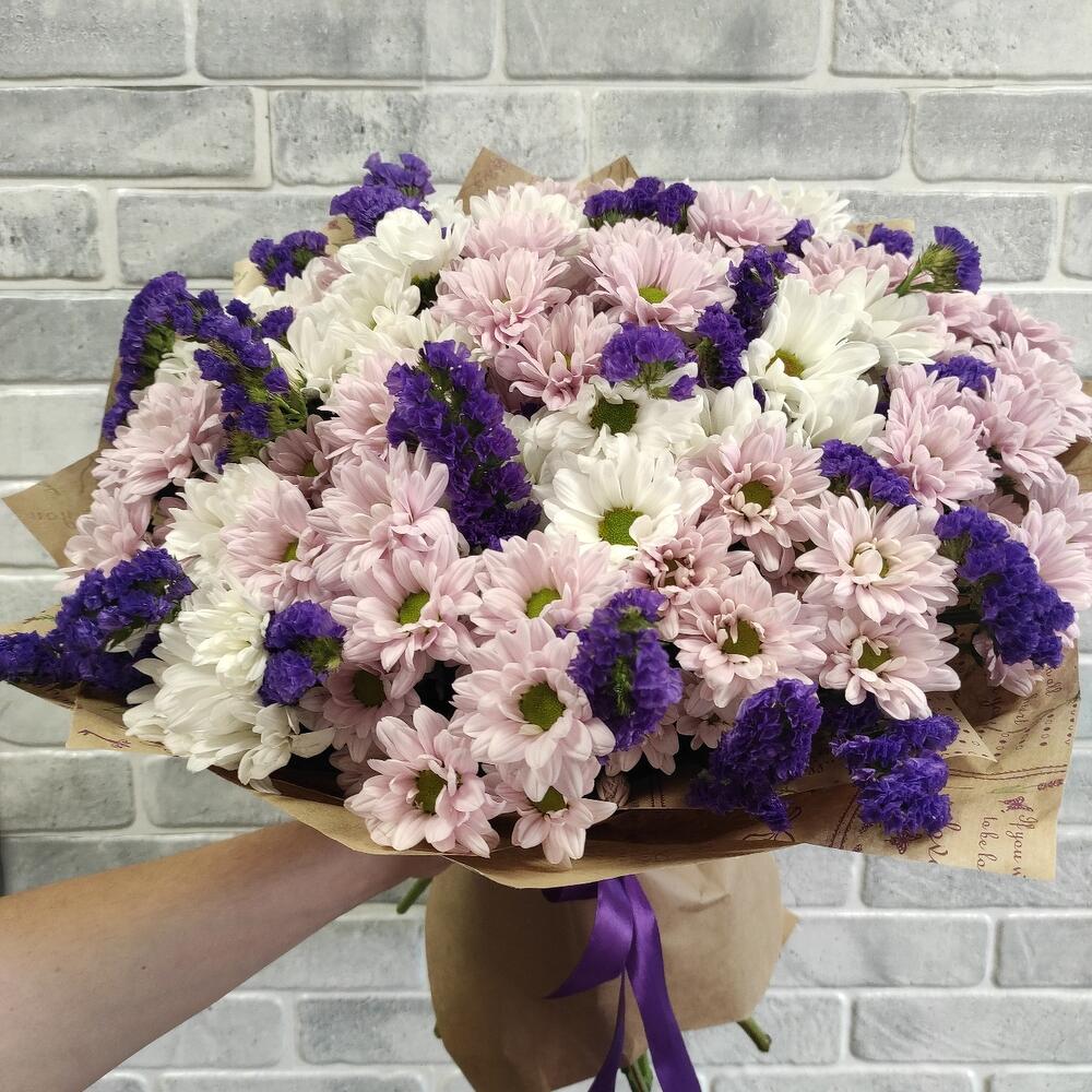 Букет из хризантем и статицы — отличный выбор для подарка! На сайте вы найдете красочные фотографии, которые помогут сделать выбор. Цена букета — 5300 руб.