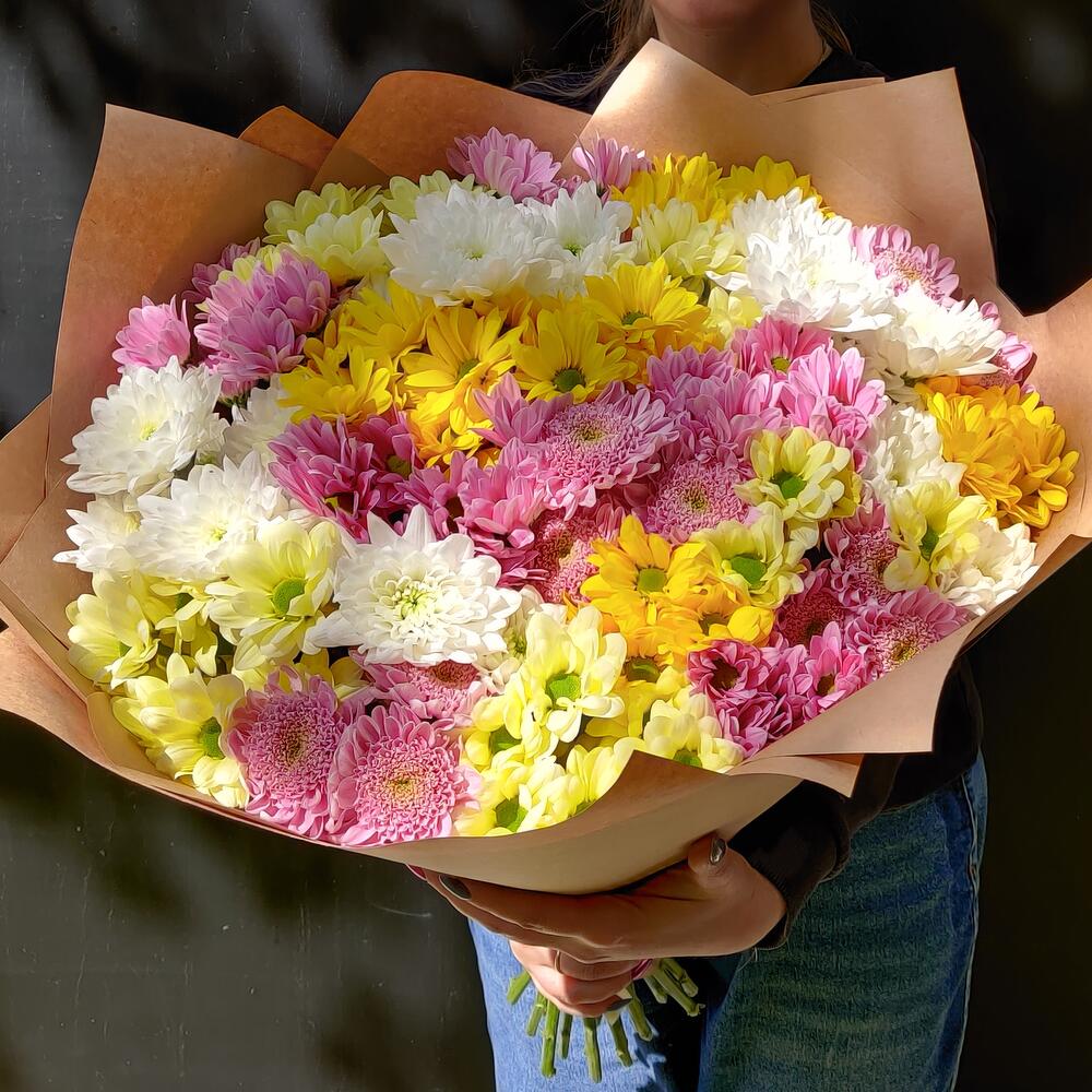 Букет из хризантем "Летний день" — отличный выбор для подарка! На сайте вы найдете красочные фотографии, которые помогут сделать выбор. Цена букета — 6300 руб.