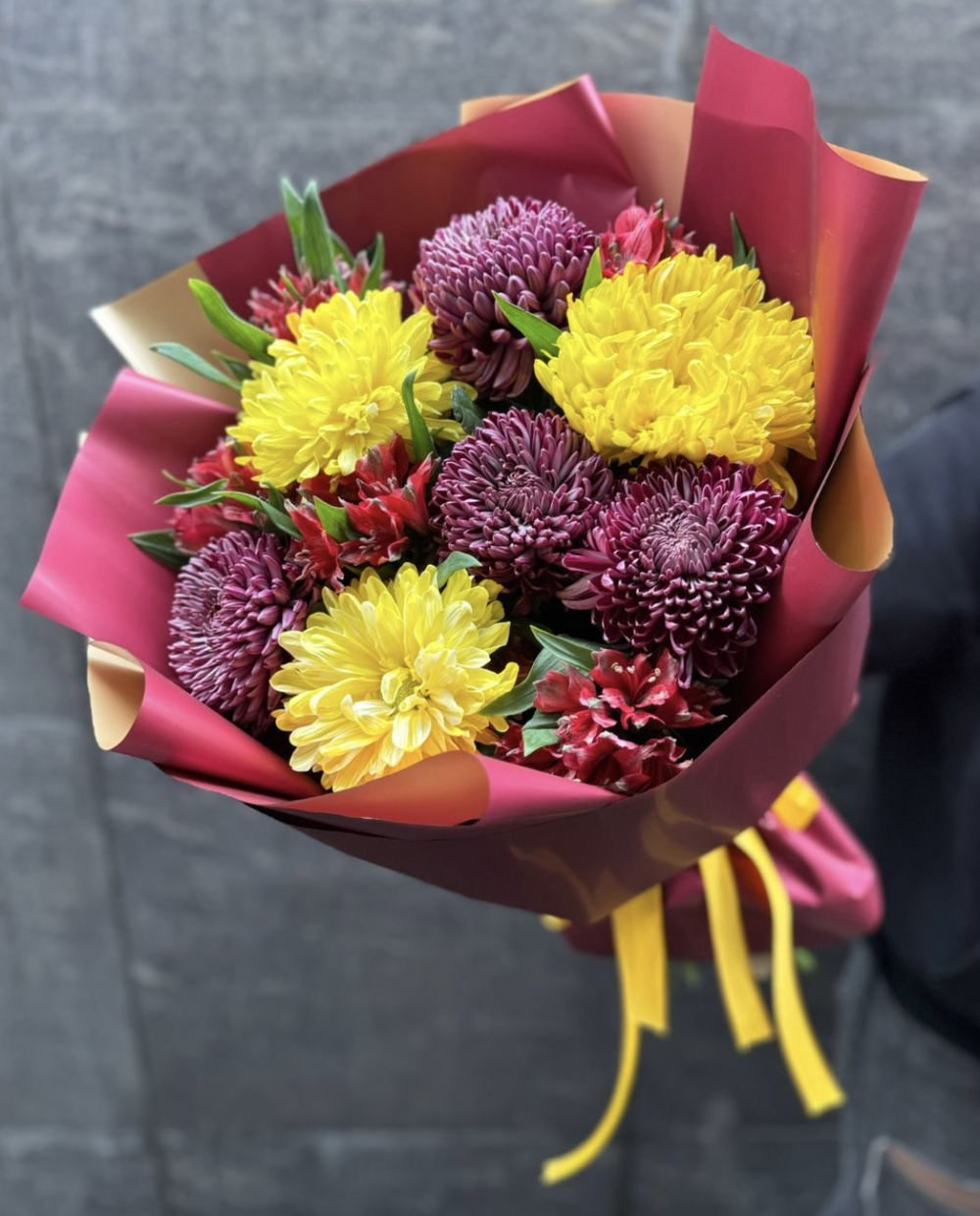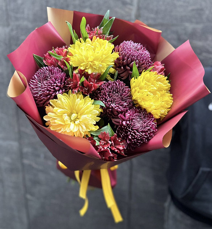 На фото - Букет хризантем «Карусель». В составе данной композиции: Хризантема одноголовая - 7 шт., альстромерия - 5 шт..