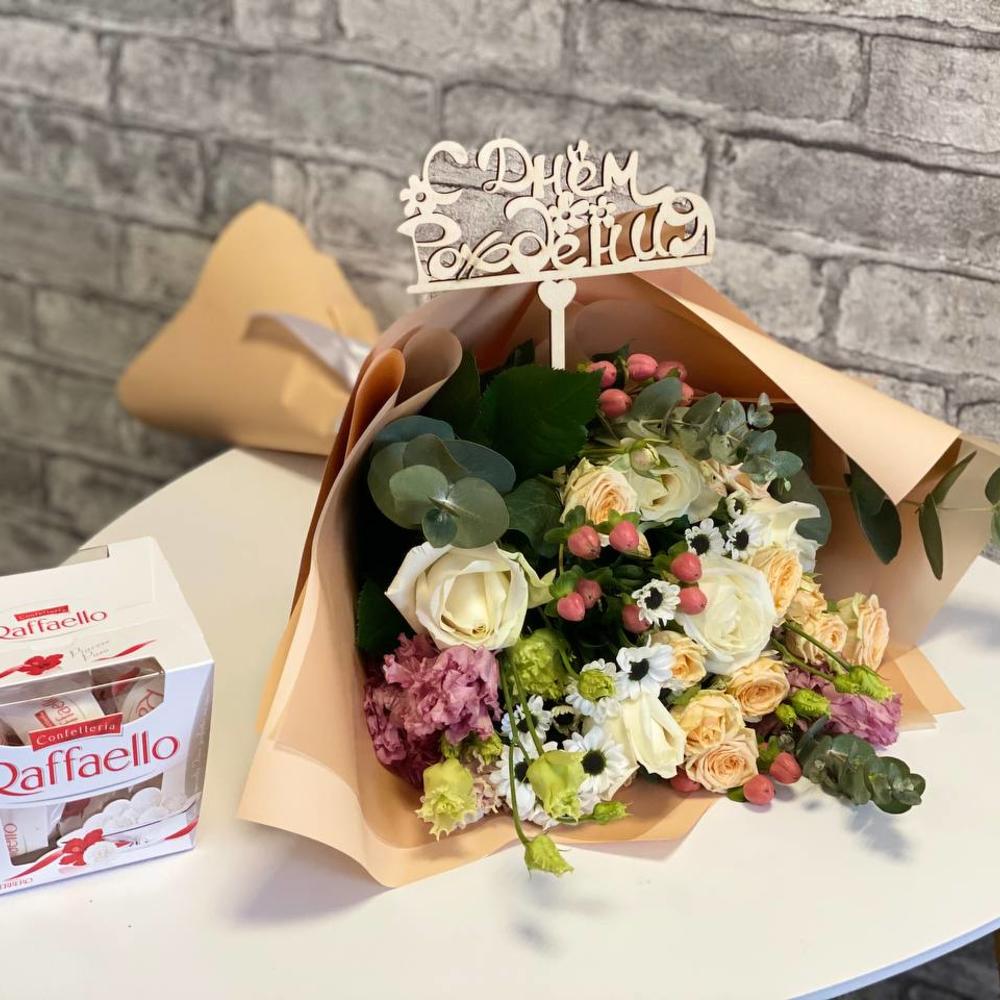 Букет "Крем-брюле" с рафаэлло и топпером — отличный выбор для подарка! На сайте вы найдете красочные фотографии, которые помогут сделать выбор. Цена букета — 6700 руб.