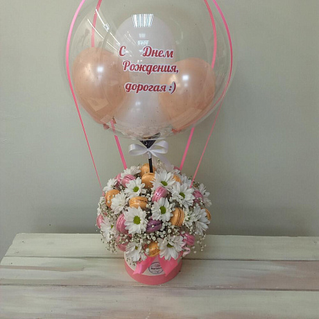 <p>На фото - Букет цветов "Анжеличка". В составе данной композиции: макарон (пирожное) - 15 шт.; Хризантема кустовая - 5 шт.; Гипсофила - 3 шт.; Коробка шляпная - 1 шт.; Оазис флористический - 1 шт.; большой шар - 1 шт.; Мини шары - 7 шт.; Конфетти - 1 шт.; Лента атласная - 2 шт.; Открыточка с вашими пожеланиями - 1 шт..</p> <p>На сайте "Доступная доставка цветов" Вы найдете большой выбор недорогих букетов, цветочных композиций для любого повода.</p> <p>У нас можно заказать Букет цветов "Анжеличка" с доставкой по Москве.</p>