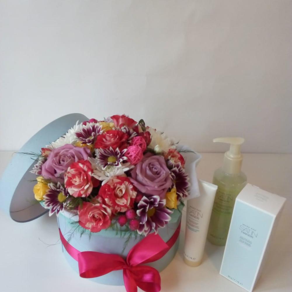 На фото - Букет цветов "Для Вашей Королевы". В составе данной композиции: Роза - 3 шт.; Роза кустовая - 5 шт.; Хризантема кустовая - 5 шт.; Зелень - 7 шт.; Декор - 5 шт.; набор для ухода за руками - 1 шт..
