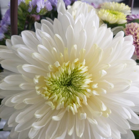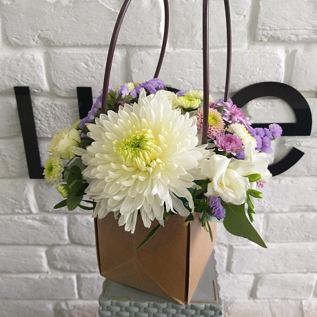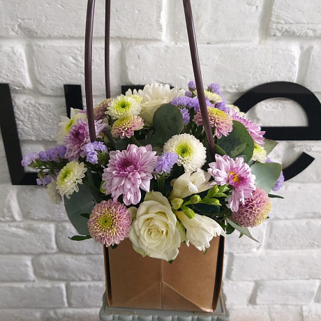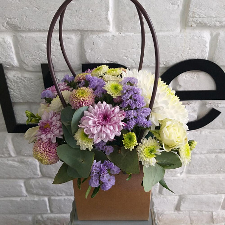 Состав: Хризантема - 1 шт.; Хризантема кустовая - 5 шт.; Статица - 1 шт.; Фрезия - 2 шт.; Роза кустовая - 1 шт.; Оазис флористический - 1 шт.; Сумка крафт - 1 шт.; Эвкалипт - 3 шт.