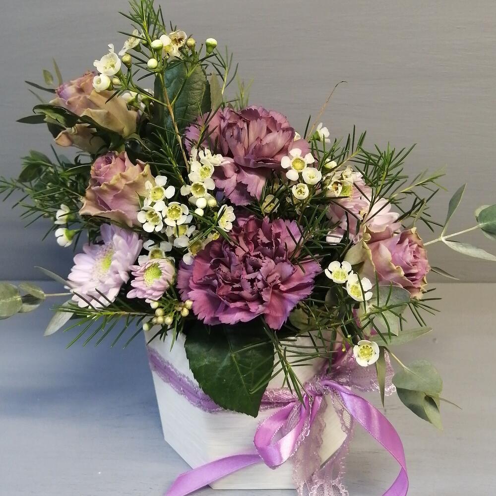 Состав: Роза - 3 шт.; Диантус - 3 шт.; Ваксфлауэр - 3 шт.; Хризантема кустовая - 1 шт.; Эвкалипт - 3 шт.; Коробка - 1 шт.; Кружево - 1 шт.