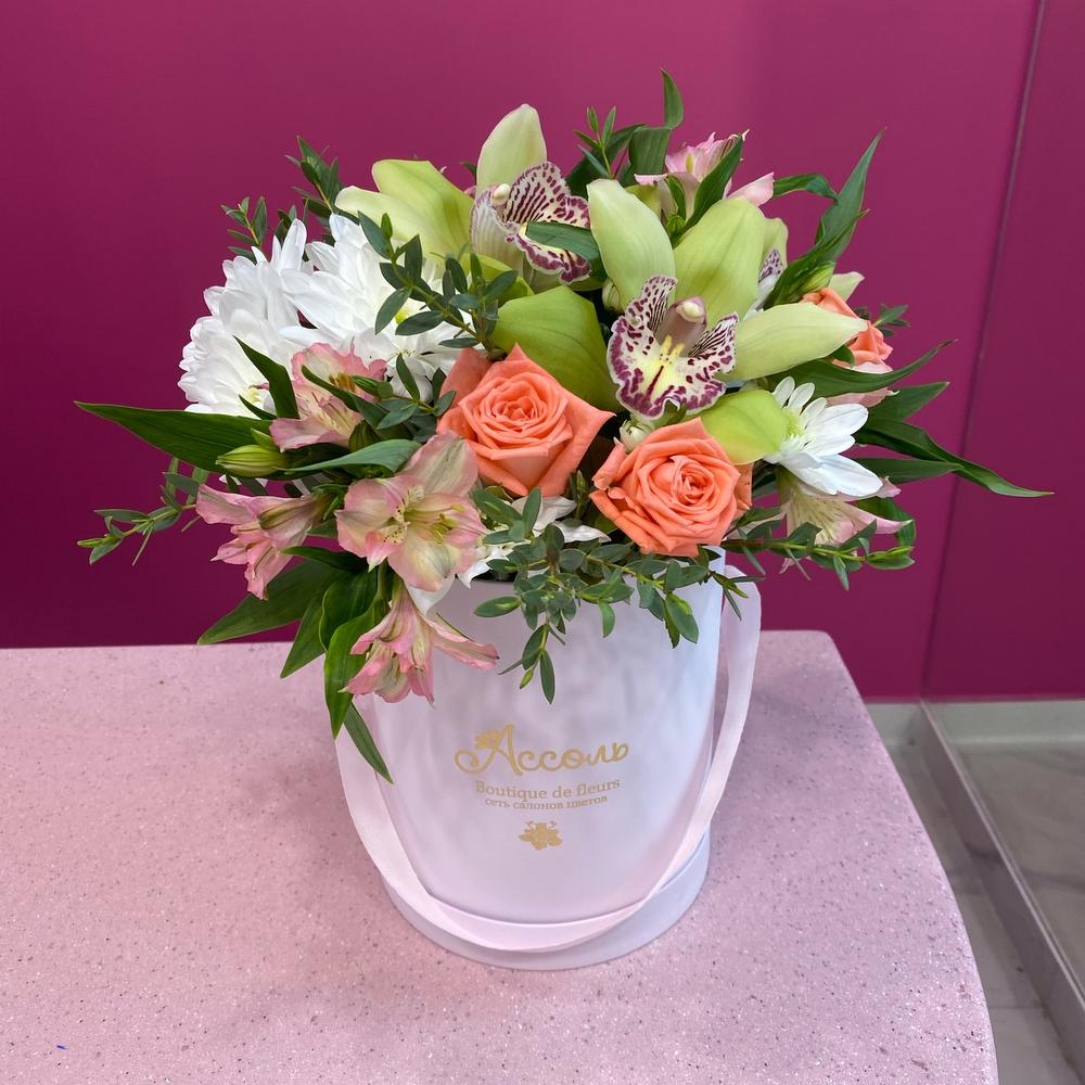 На фото - Цветы в коробке (Альстромерия - 3 шт). В составе данной композиции: Хризантема кустовая - 1 шт.; Роза - 5 шт.; Писташ - 2 шт.; Альстромерия - 3 шт.; Орхидея Цимбидиум - 2 шт.; Оазис флористический - 1 шт.; Коробка шляпная - 1 шт..