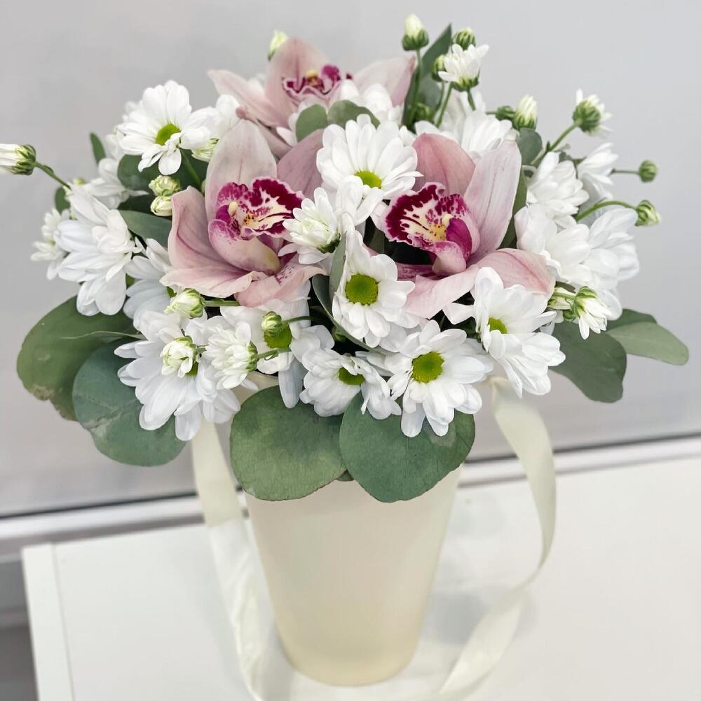 На фото - Цветы в коробке №315. В составе данной композиции: ЦИМБИДИУМ - 3 шт.; Оазис - 1 шт.; Хризантема кустовая - 3 шт.; Коробка конус - 1 шт.; Эвкалипт - 5 шт..
