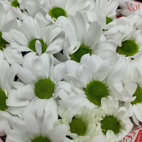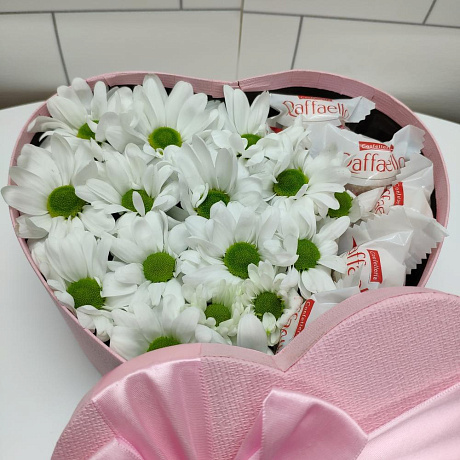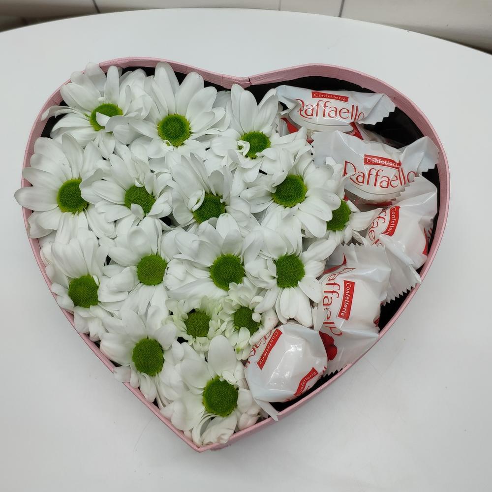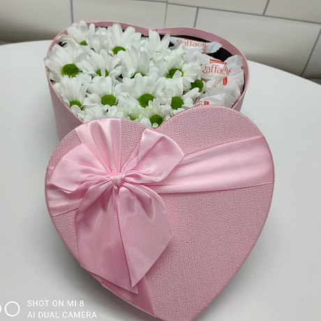 На фото - Цветы в коробке сердце 3. В составе данной композиции: Хризантема кустовая - 25 шт.; Раффаэлло - 5 шт.; Коробка шляпная - 1 шт.; Губка флористическая - 1 шт..
