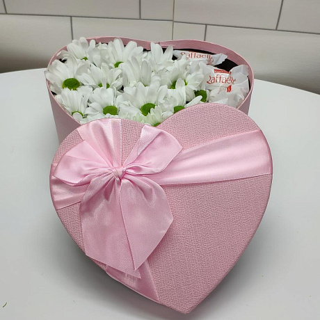 <p>На фото - Цветы в коробке сердце 3. В составе данной композиции: Хризантема кустовая - 25 шт.; Раффаэлло - 5 шт.; Коробка шляпная - 1 шт.; Губка флористическая - 1 шт..</p> <p>На сайте "Доступная доставка цветов" Вы найдете большой выбор недорогих букетов, цветочных композиций для любого повода.</p> <p>У нас можно заказать Цветы в коробке сердце 3 с доставкой по Москве.</p>
