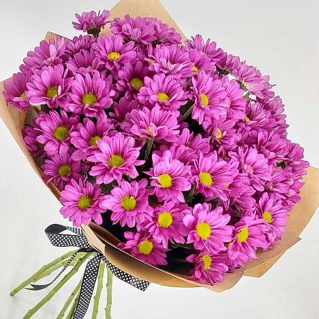 На фото - Фиолетовые ромашки 9. В составе данной композиции: Хризантема кустовая - 9 шт.; Упаковка крафт - 3 шт.; Лента дизайнерская - 1 шт..