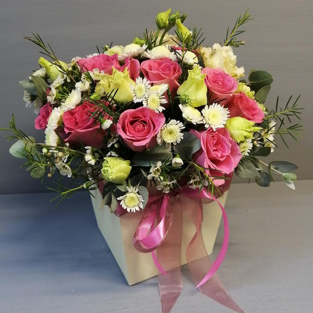 На фото - Букет цветов "Флоренция" №163. В составе данной композиции: Роза - 15 шт.; Лизиантус - 2 шт.; Ваксфлауэр - 3 шт.; Хризантема кустовая - 4 шт.; Эвкалипт - 3 шт.; Коробка - 1 шт.; Лента - 2 шт.; Оазис флористический - 1 шт..