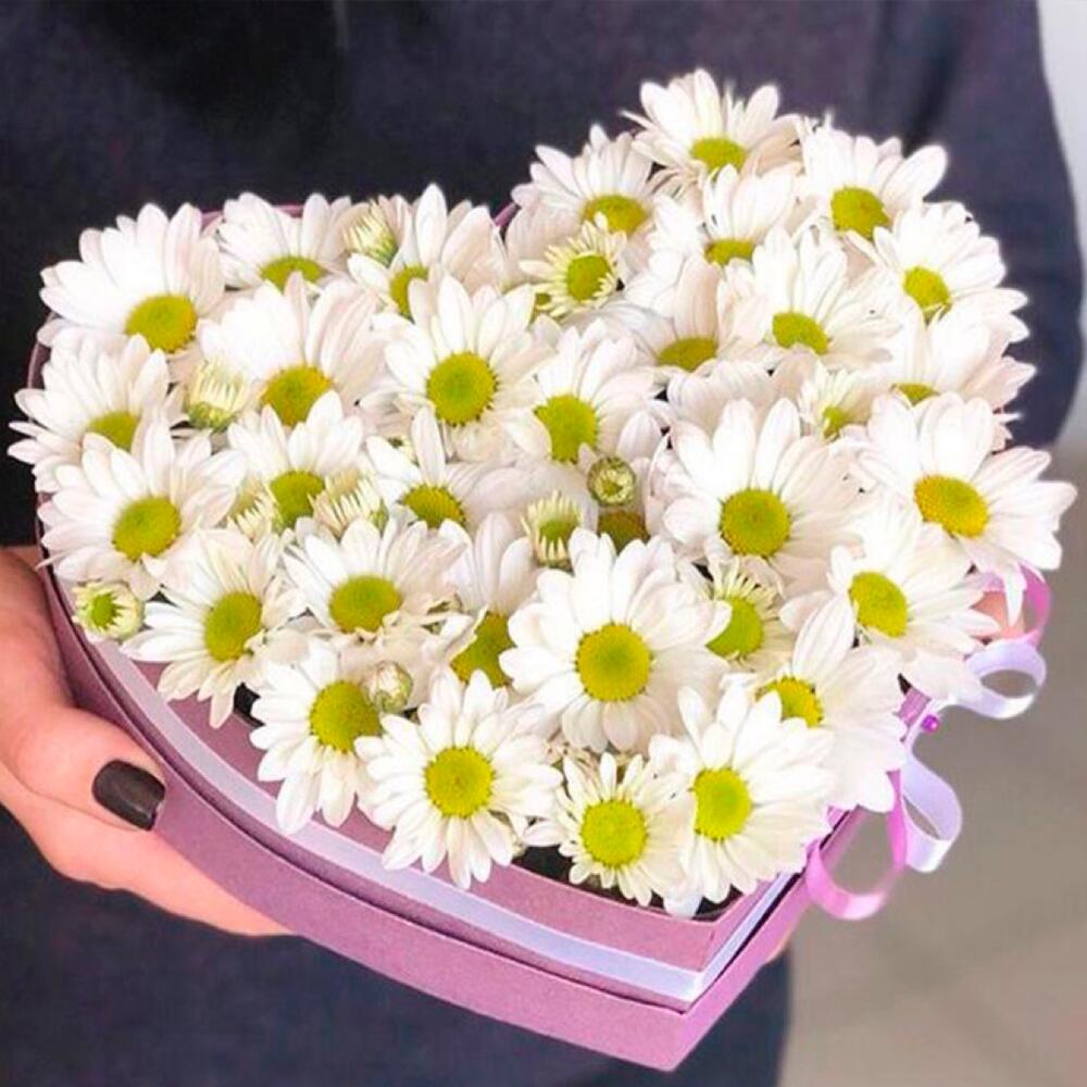 На фото - Коробка цветов №172. В составе данной композиции: Хризантема кустовая - 7 шт.; Оазис флористический - 1 шт.; Коробка - 1 шт..