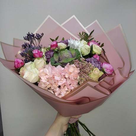 Закажите Красивый букет с Гортензией, брассикой, ассорти роз и цветами с доставкой в Москве и МО.