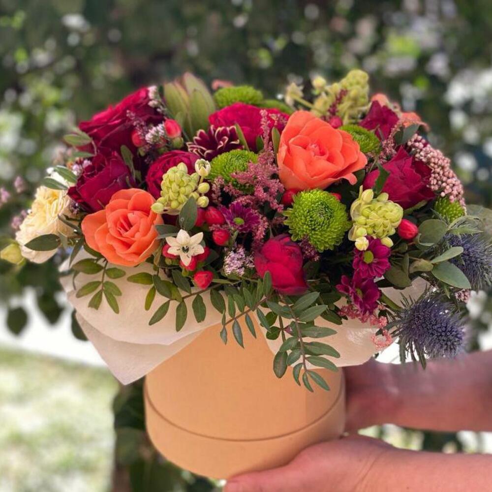 На фото - Букет цветов "Лето" №179. В составе данной композиции: Роза оранжевая - 4 шт.; Роза бордовая - 4 шт.; Гиперикум - 4 шт.; Роза кустовая - 3 шт.; Хризантема сантинии - 2 шт.; Пистация - 1 шт.; Шляпная коробка - 1 шт.; Оазис - 1 шт..