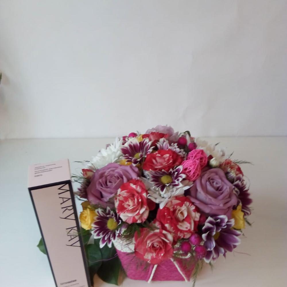 На фото - Букет цветов "Милая моя" №161. В составе данной композиции: Роза - 3 шт.; Роза кустовая - 5 шт.; Хризантема кустовая - 5 шт.; Зелень - 3 шт.; Декор - 5 шт.; тоник мери кей - 1 шт..