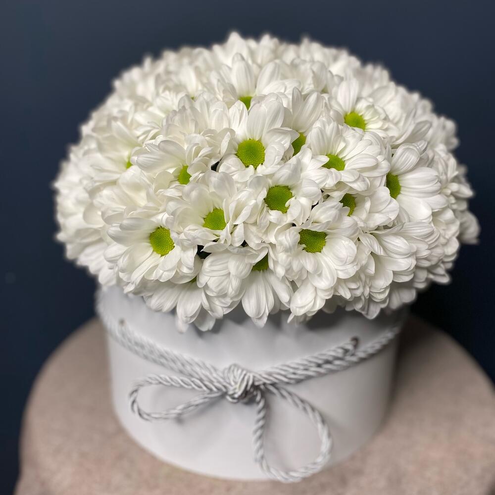 На фото - Ромашка №162. В составе данной композиции: Коробка - 1 шт.; Оазис флористический - 2 шт.; Хризантема кустовая - 11 шт..