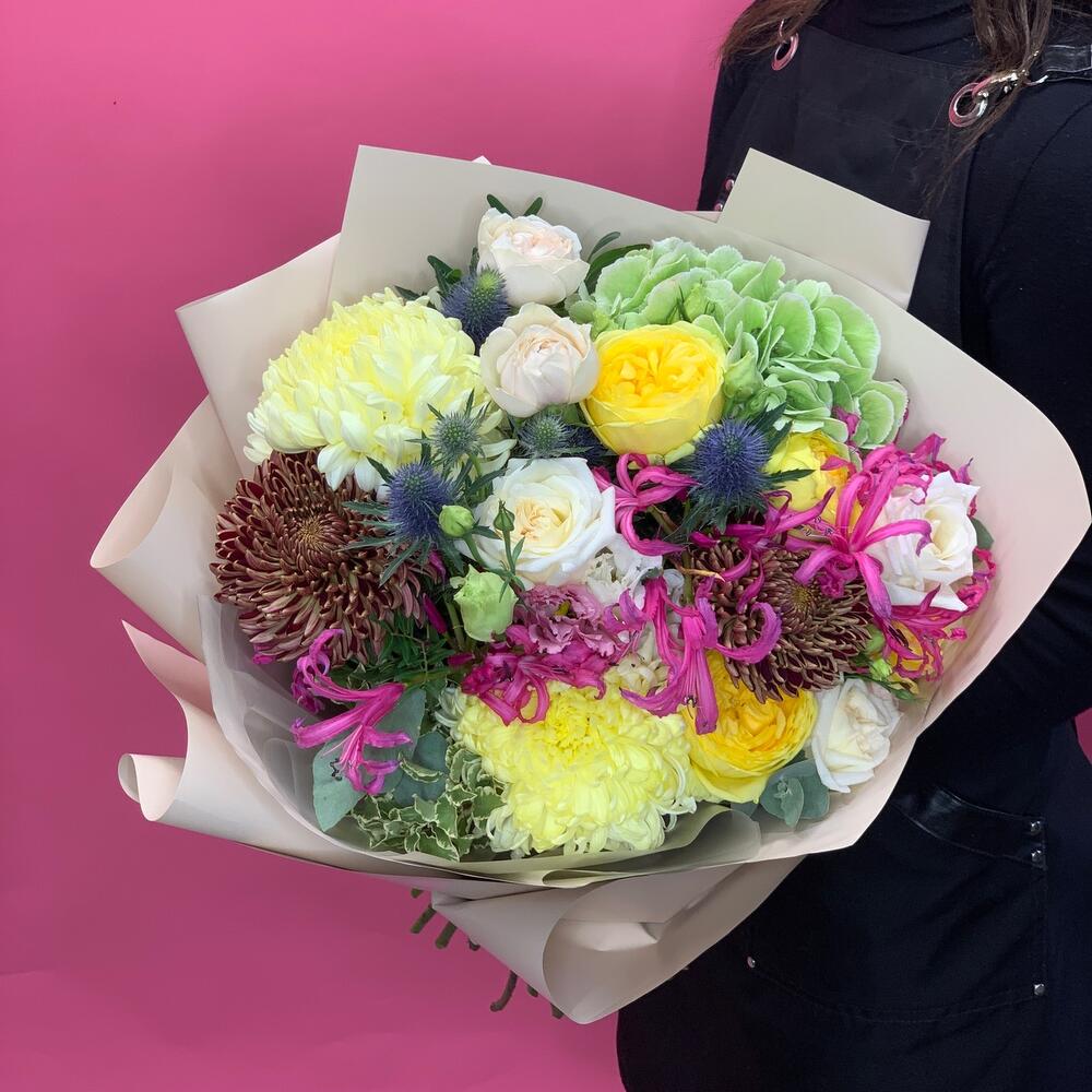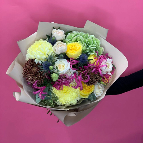 Яркий букет с гортензиями и французскими розами — отличный выбор для подарка! На сайте вы найдете красочные фотографии, которые помогут сделать выбор. Цена букета — 8900 руб.