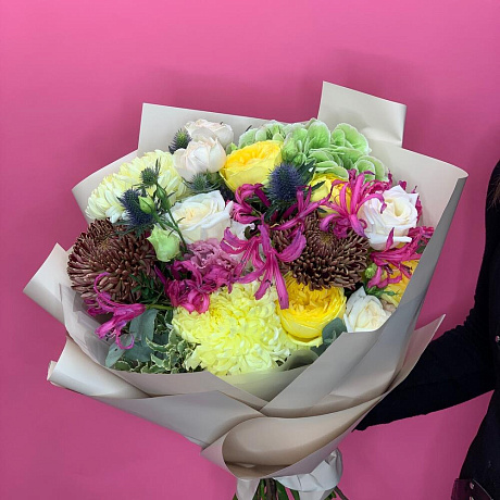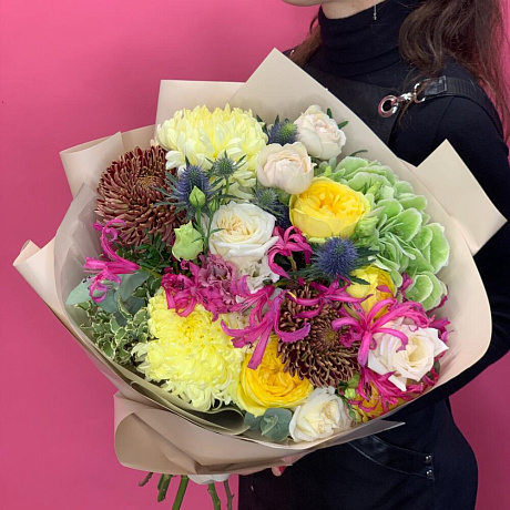 Закажите Яркий букет с гортензиями и французскими розами с доставкой в Москве и МО.