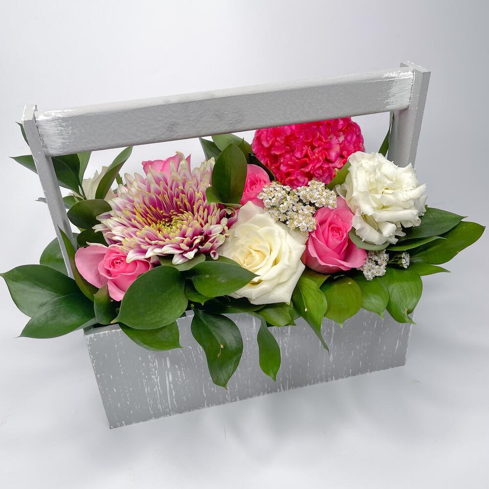 Ящик с розовой композицией из цветов