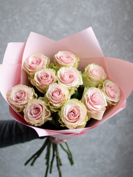 На фото - Букет нежных пионовидных роз. В составе данной композиции: Роза пионовидная фрутето- 11 шт.; Пленка матовая - 4 шт.; Лента атласная - 3 шт..