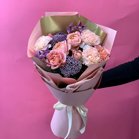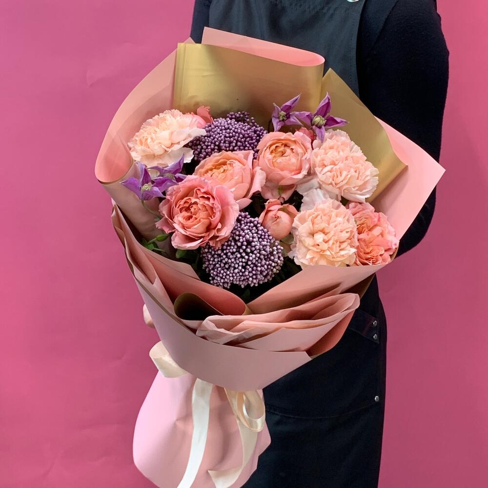Нежный букет с пионовидной розой и ягодами озотамнуса — отличный выбор для подарка! На сайте вы найдете красочные фотографии, которые помогут сделать выбор. Цена букета — 3600 руб.