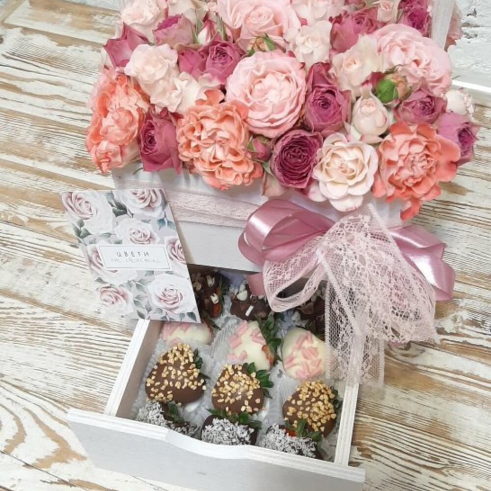 Пионовидные кустовые розы с клубникой в шоколаде — отличный выбор для подарка! На сайте вы найдете красочные фотографии, которые помогут сделать выбор. Цена букета — 6100 руб.