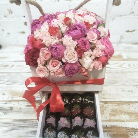 Закажите Пионовидные кустовые розы с клубникой в шоколаде с доставкой в Москве и МО.