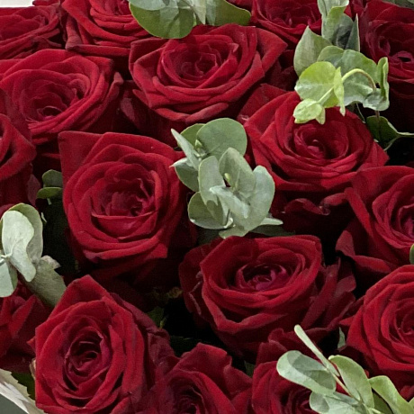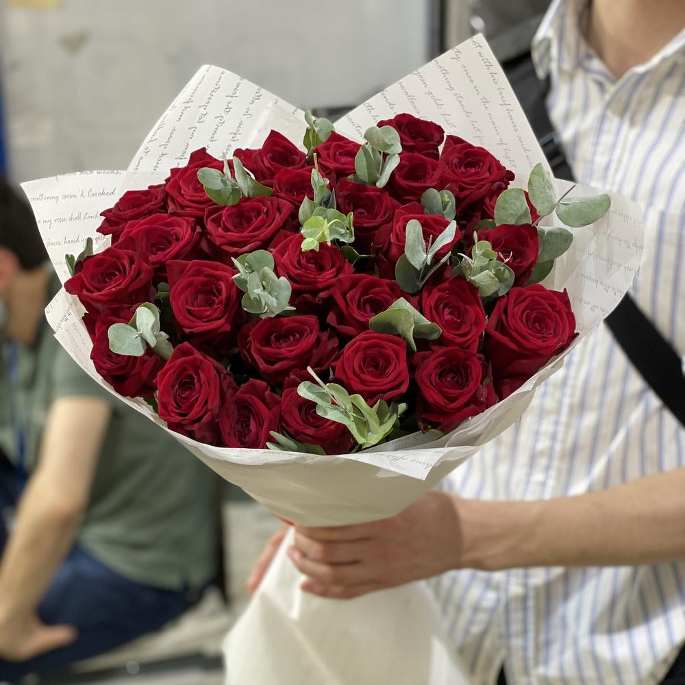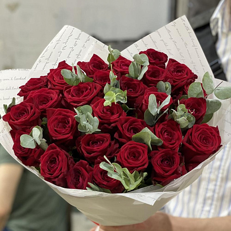 Закажите 25 красных роз с зеленью с доставкой в Москве и МО.