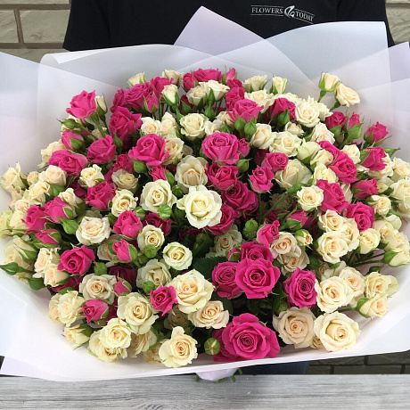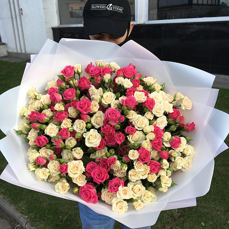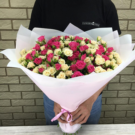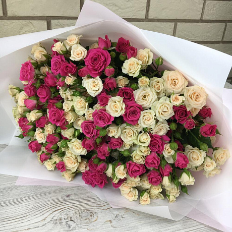 35 кустовых роз в дизайнерской пленке — отличный выбор для подарка! На сайте вы найдете красочные фотографии, которые помогут сделать выбор. Цена букета — 8000 руб.