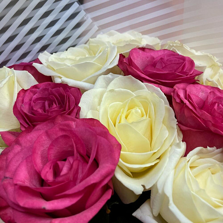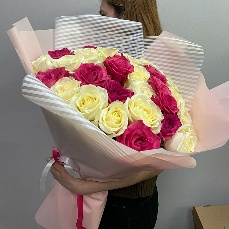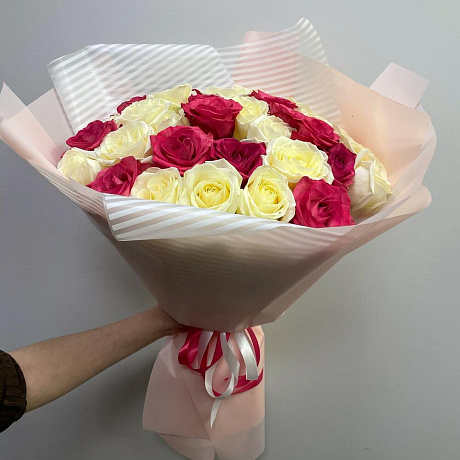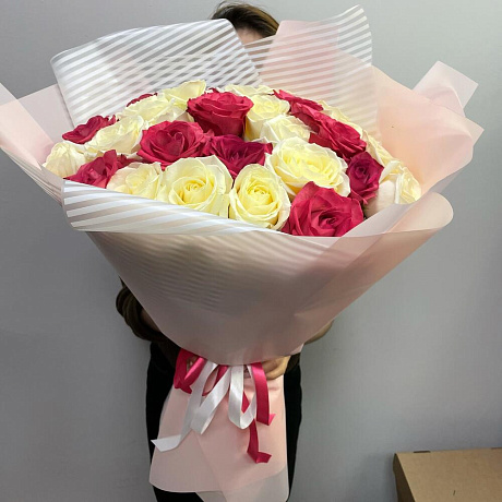 Букет бело-розовых роз — отличный выбор для подарка! На сайте вы найдете красочные фотографии, которые помогут сделать выбор. Цена букета — 6500 руб.