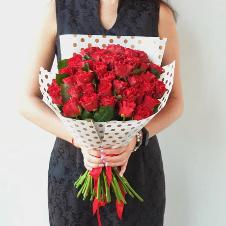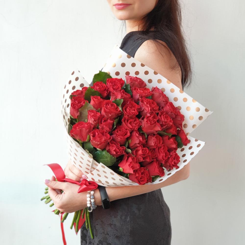 Закажите Букет из 35 алых роз в стильной упаковке с доставкой в Москве и МО.