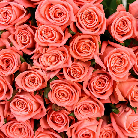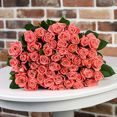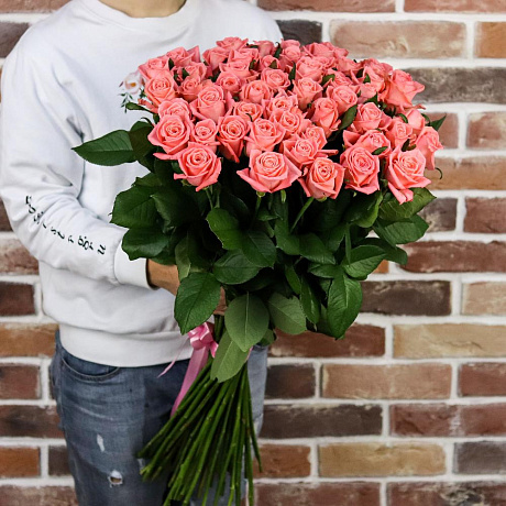 Букет из 51 коралловой розы (70 см). N884 — отличный выбор для подарка! На сайте вы найдете красочные фотографии, которые помогут сделать выбор. Цена букета — 7400 руб.