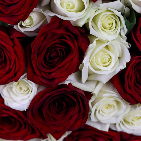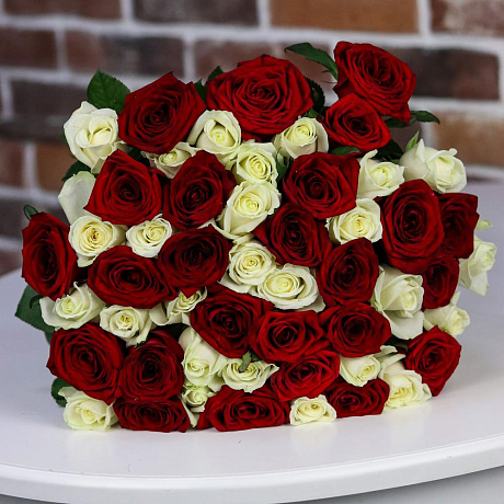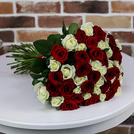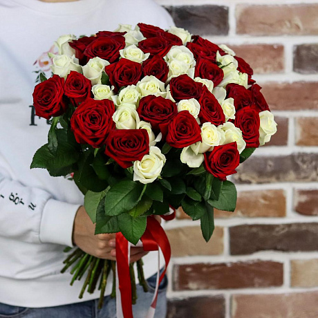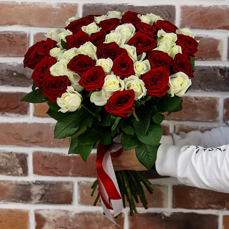 Букет из 51 красно-белой розы (50 см). N885 — отличный выбор для подарка! На сайте вы найдете красочные фотографии, которые помогут сделать выбор. Цена букета — 6100 руб.