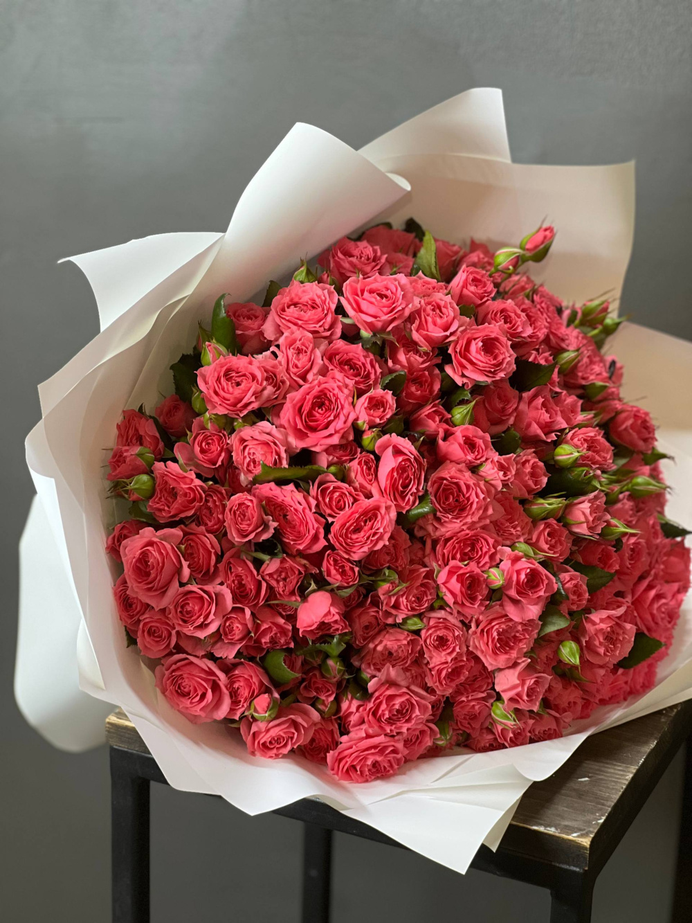 На фото - Букет из кустовых роз 51. В составе данной композиции: Роза кустовая Лидия - 51 шт.; Упаковка дизайнерская - 1 шт..