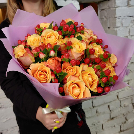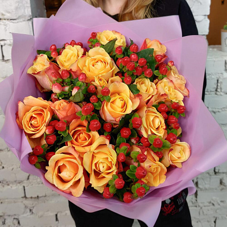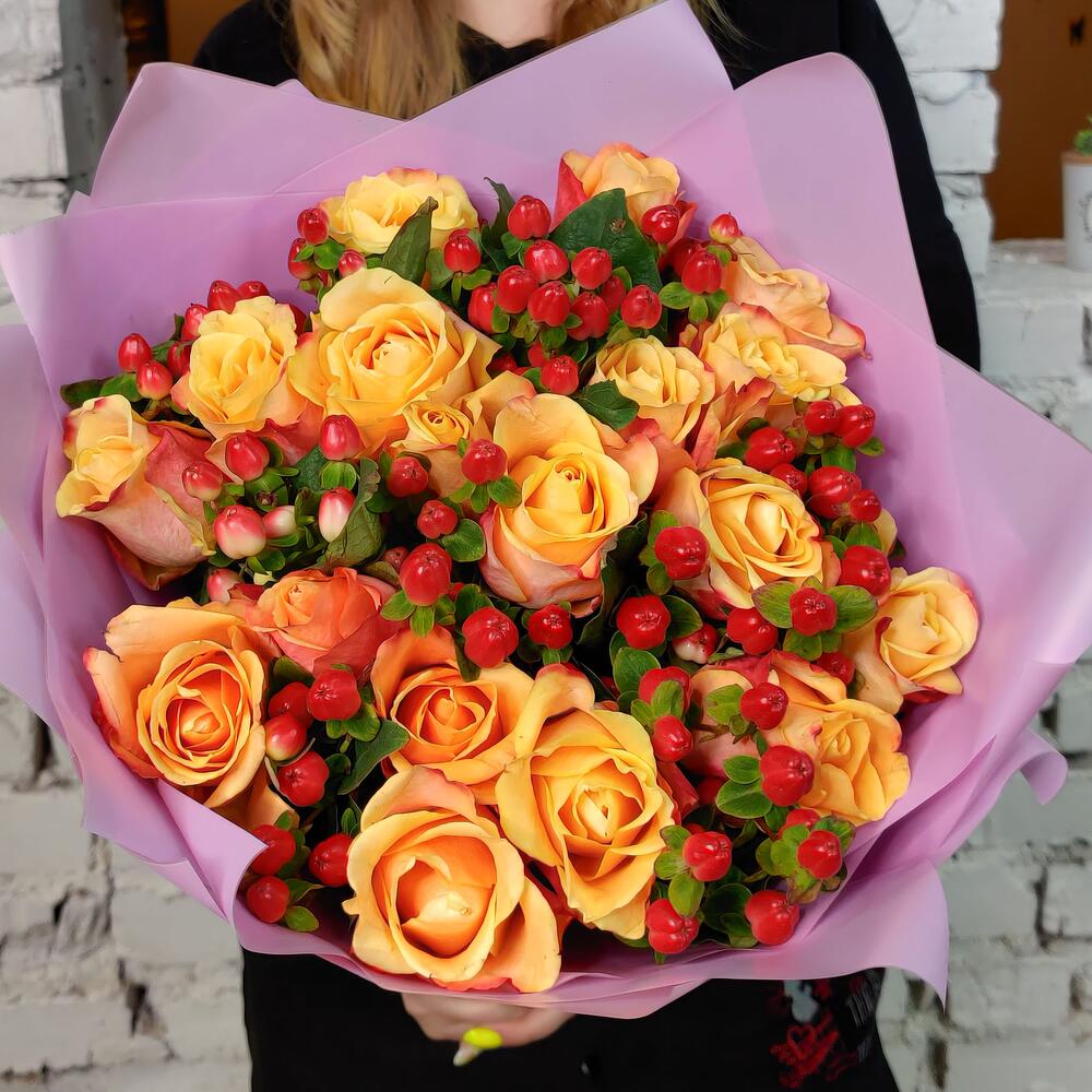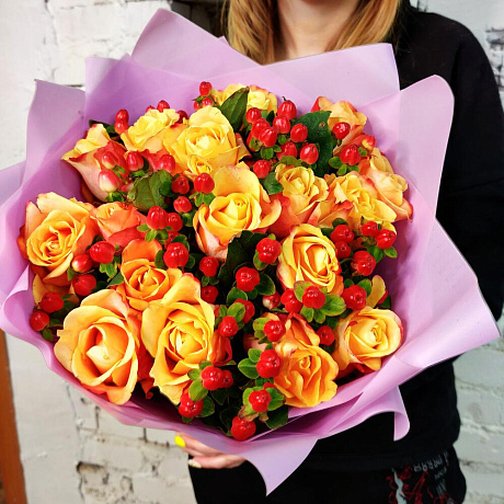 Закажите Букет из роз и гиперикума "Верона" с доставкой в Москве и МО.